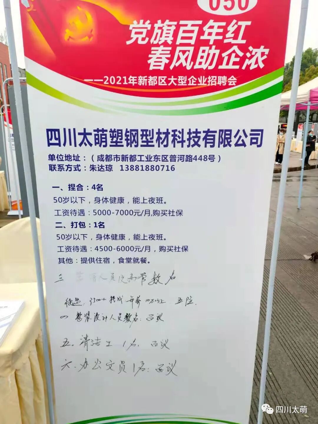 太萌塑钢型材科技有限公司参加了由新都区政府主办的2021年新都大型春季招聘会,本次招聘会一共汇聚了两百家左右企业参加,招聘现场的求职者络绎不绝。在此次举办的招聘会中,与我公司达成就业意向的有40余人。